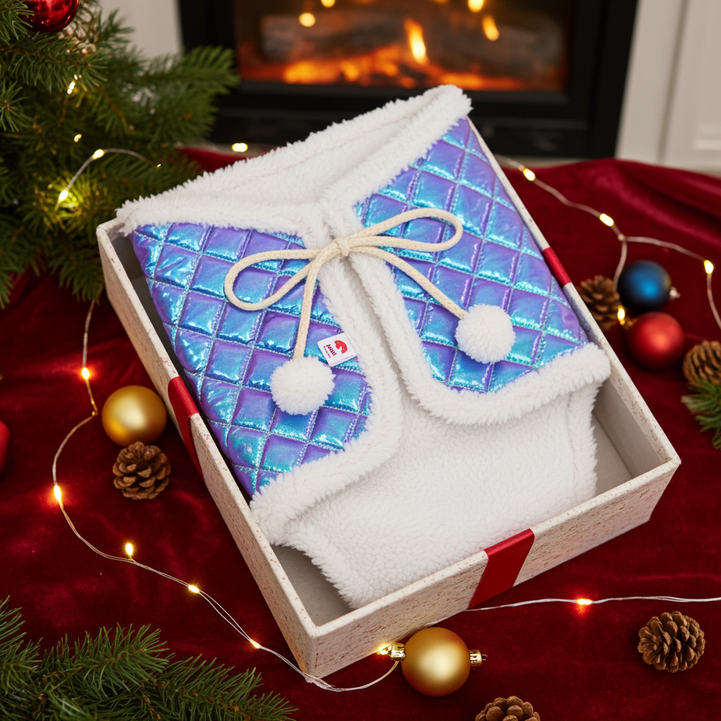 Blanket is sewn from high-quality shiny quilted material. The inner side of the blanket is lined with soft lamb fur. Cords, that are finished with pompoms from lamb fur are used for attachment.